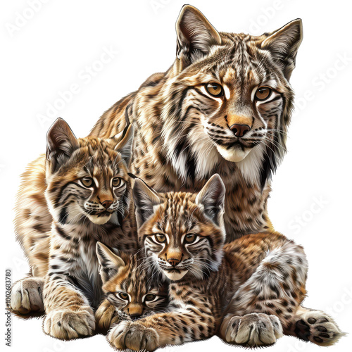 Fototapeta premium A majestic lynx family featuring a parent and three adorable kittens,...