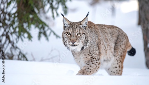© Wiwik, Obraz premium A majestic lynx strolls through a snowy forest landscape, its gaze focused and alert.