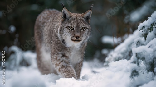 © Bussakon, Obraz premium A majestic lynx walks cautiously through a snow covered forest during winter its gaze alert and focused on its surroundings