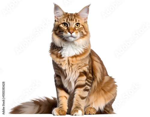 © SulasTree, Obraz premium A majestic Maine Coon cat with striking amber eyes sits gracefully looking forward