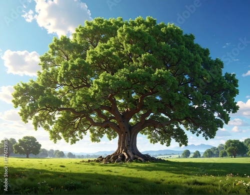 Fototapeta premium A majestic, mature tree stands proudly in a lush green field under a clear,...