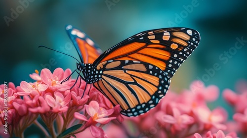 © Ahmad M., Fototapeta premium A majestic monarch butterfly, with vibrant orange and black wings, delicately perched on a cluster of pink flowers, enjoying its day in nature