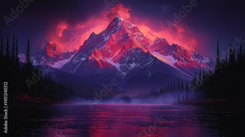 Naklejka premium A majestic mountain peak bathed in vibrant sunset hues, overlooking a tranquil river.