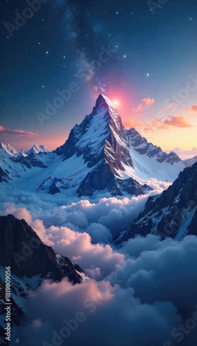 Fototapeta premium A majestic mountain range piercing the clouds, resembling a colossal universe in miniature Stars seem to swirl around its peaks, a breathtaking cosmic landscape , sublime, elevation