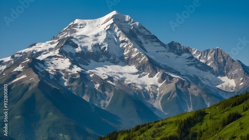 © Abdullah, Fototapeta premium A majestic mountain range, with snow-capped peaks and lush green valleys, standing tall against a clear blue sky.