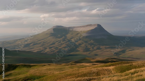 Fototapeta premium A majestic mountain rises above rolling green hills under a dramatic sky,...