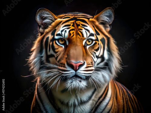 Fototapeta premium A majestic night tiger dominates this powerful wildlife photograph, its dark...