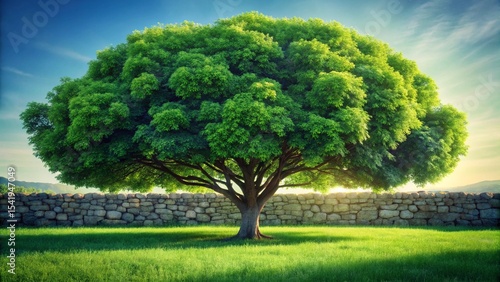 © Abdullah, Fototapeta premium A Majestic Oak Tree in a Green Field with a Stone Wall