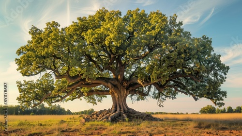 Fototapeta premium A majestic oak tree with deep roots and broad branches stands tall, symbolizing strength and resilience.