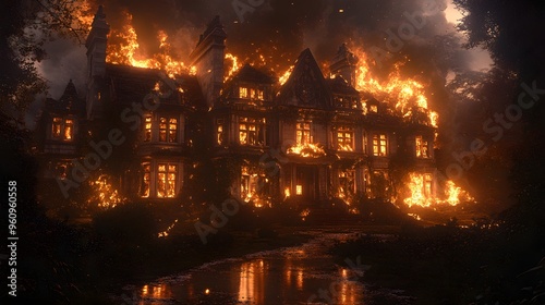 Naklejka premium A majestic old mansion devoured by flames, ash clouds billowing against the night sky, warm glow from the fire contrasts with cool dark surroundings, hyper-realistic, wide shot