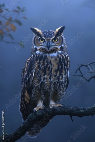 © Iswanto, Obraz premium A majestic owl perched on a branch in a misty forest setting.