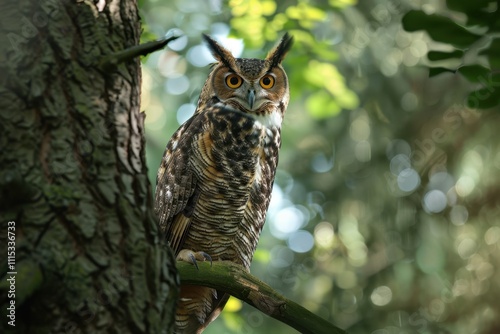 © Azadart, Fototapeta premium A majestic owl perched on a tree branch under a dramatic sky filled with clouds during twilight, showcasing nature's beauty and tranquility