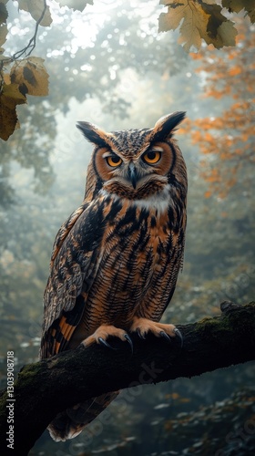 © kwang, Obraz premium A majestic owl perches on a branch, surrounded by a misty forest backdrop, showcasing its striking plumage and intense gaze.