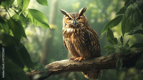 Obraz premium A majestic owl perches on a weathered branch surrounded by lush green leaves,...