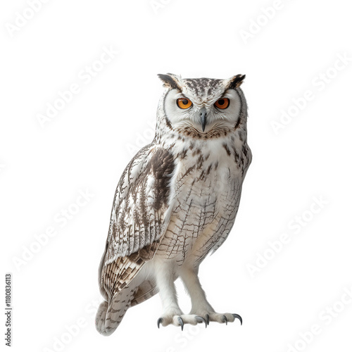 Fototapeta premium a majestic owl with striking orange eyes and intricate feather patterns. standing prominently against a plain white background its posture and gaze convey a sense of wisdom and alertness. making it a