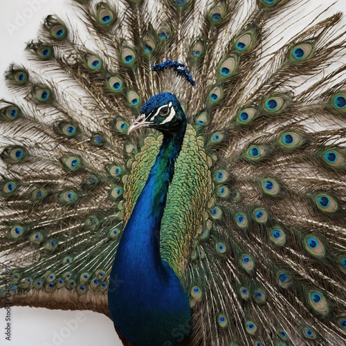 © Ubaid, Naklejka premium "A majestic peacock standing tall with its iridescent blue and green feathers shimmering, its long elegant tail slightly fanned out, set against a clean white background."