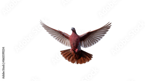 © Nilima, Fototapeta premium A majestic pink pigeon soars against a stark black background