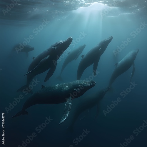 Obraz premium A Majestic Pod of Whales Ascending Towards Light