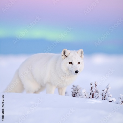 Naklejka premium A majestic polar bear stands gracefully on a snowy landscape, its thick white...