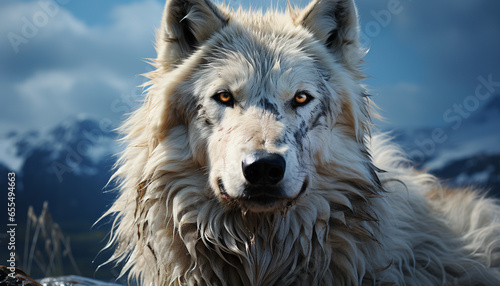 © Gstudio, Fototapeta premium A majestic purebred dog sits outdoors in the snowy mountains generated by AI