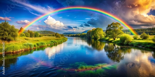 © Kukar Studio, Obraz premium A Majestic Rainbow Arcs Over a Tranquil River, Its Vibrant Hues Reflecting in the Still Water, Surrounded by Lush Greenery and Rolling Hills