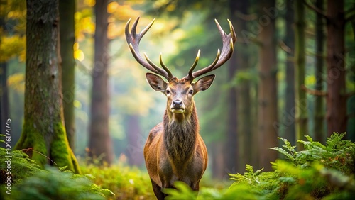 Naklejka premium A Majestic Red Deer Stands Proudly Among the Lush Green Ferns in a...