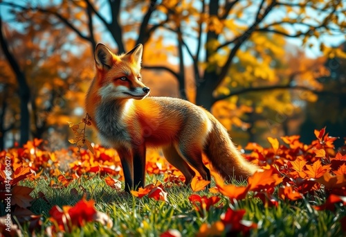 © Dounghathai, Naklejka premium A Majestic Red Fox Amidst a Vibrant Autumnal Landscape, Basking in the Golden Sunlight, Surrounded by a Carpet of Fallen Leaves