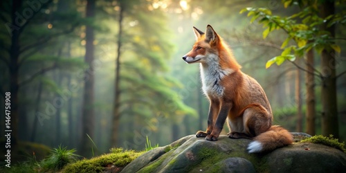 © Dounghathai, Naklejka premium A Majestic Red Fox Perched on a Mossy Rock, Serene and Alert in a Sun-Dappled Forest