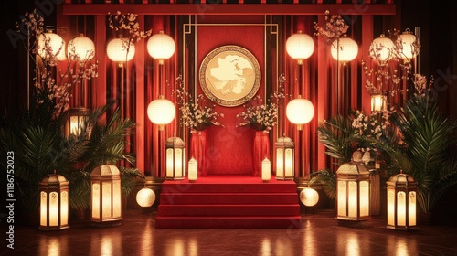 Fototapeta premium A majestic red podium, accented with gold detailing, surrounded by traditional lanterns, perfect for a cultural celebration.