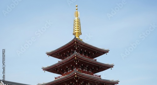 © Muhammad, Fototapeta premium A majestic red wooden pagoda against a serene blue sky background