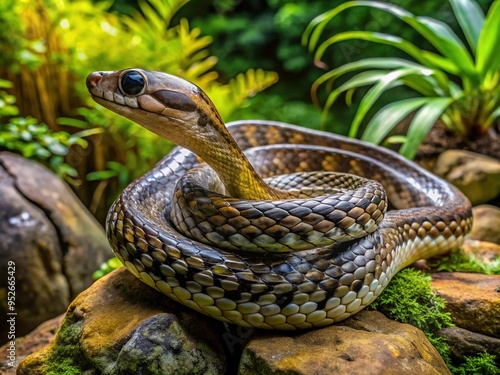 © Adisorn, Fototapeta premium A majestic rhino rat snake, with its distinctive keeled scales and brown-gray pattern, slithers through a rocky outcropping in a lush, green forest habitat.