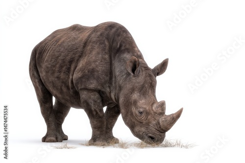 Obraz premium A majestic rhinoceros grazes peacefully against a stark white backdrop.
