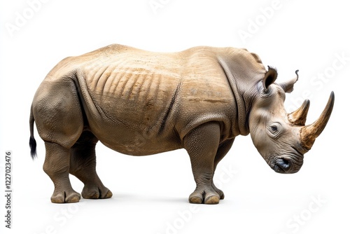 © Zahra, Fototapeta premium A majestic rhinoceros stands against a stark white background.