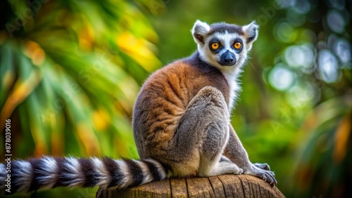 © Wanlop, Fototapeta premium A majestic ring-tailed lemur's head, with vibrant eyes and a fluffy coat, sits regally, showcasing its distinctively long tail.