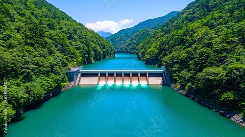 Naklejka premium A majestic river flowing cleanly through a reforested valley, with a small, efficient hydroelectric power plant subtly integrated into the landscape, emphasizing clean energy sources