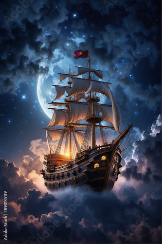 Fototapeta premium A majestic sailing ship with a flag, sailing through the clouds under a full moon.