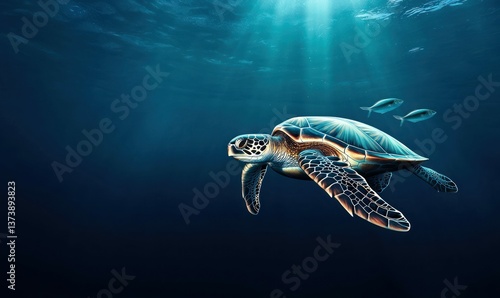Fototapeta premium A majestic sea turtle glides through the ocean depths accompanied by two...