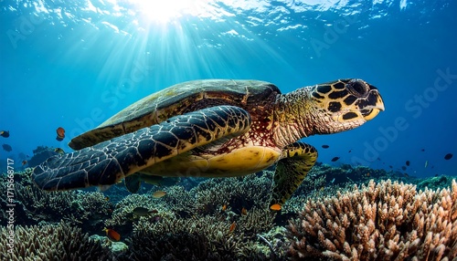 Fototapeta premium A majestic sea turtle gracefully glides through a vibrant coral reef ecosystem, bathed in the sun's underwater rays.