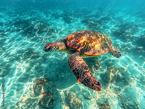Fototapeta premium A Majestic Sea Turtle's Graceful Swim Through Clear, Turquoise Water Over a...