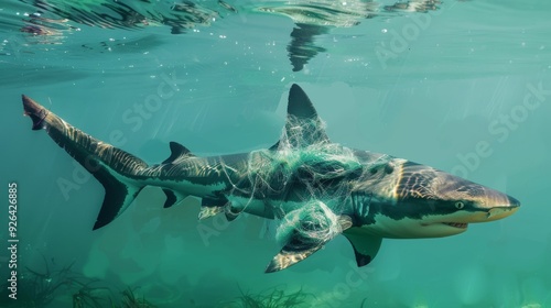 Naklejka premium A majestic shark glides through clear blue waters, showcasing its powerful...