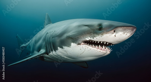 Fototapeta premium A majestic shark glides through the deep ocean, its powerful presence and sharp teeth visible