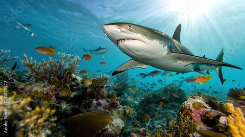 Fototapeta premium A majestic shark swimming gracefully among vibrant coral reefs in a sunlit ocean scene