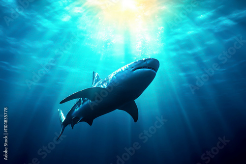 Fototapeta premium A majestic shark swimming gracefully in clear blue waters.