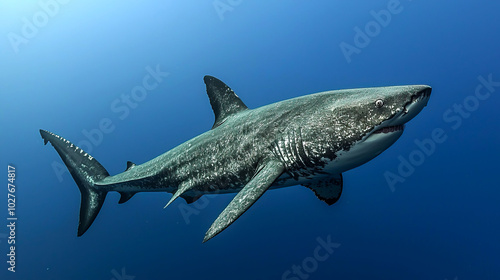 Naklejka premium A majestic shark swimming in deep blue waters.