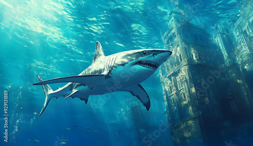 Fototapeta premium A majestic shark swims gracefully through clear blue waters, showcasing its...