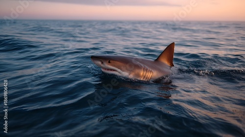 © Bussakon, Fototapeta premium A majestic shark swims near the surface of the ocean during twilight its dorsal fin cutting through the calm blue water