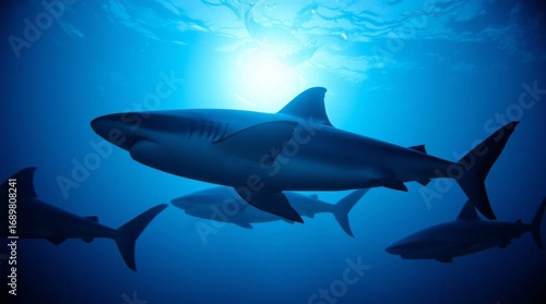 Fototapeta premium A majestic shiver of sharks glides through the deep blue ocean, backlit by...
