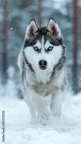 © pingpao, Fototapeta premium A majestic Siberian Husky runs through a snowy landscape, showcasing its striking blue eyes and thick fur, embodying strength and beauty in nature.