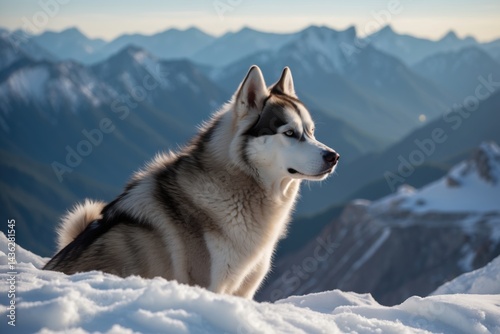 Fototapeta premium A majestic Siberian Husky sitting on a snowy mountain peak, basking in the...