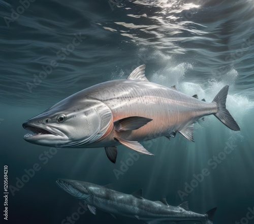 Fototapeta premium A majestic silver salmon glides through the ocean currents , ocean, finned,...